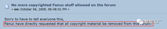 在2009年,發(fā)那科通知著名的工業(yè)機器人論壇Robotforum Support for Robotprogrammer and Users - Index刪除其網(wǎng)站上所有網(wǎng)友分享的發(fā)那科機器人的隨機文檔和技術(shù)資料,有理由相信其他的討論平臺同樣收到了類似的通知: